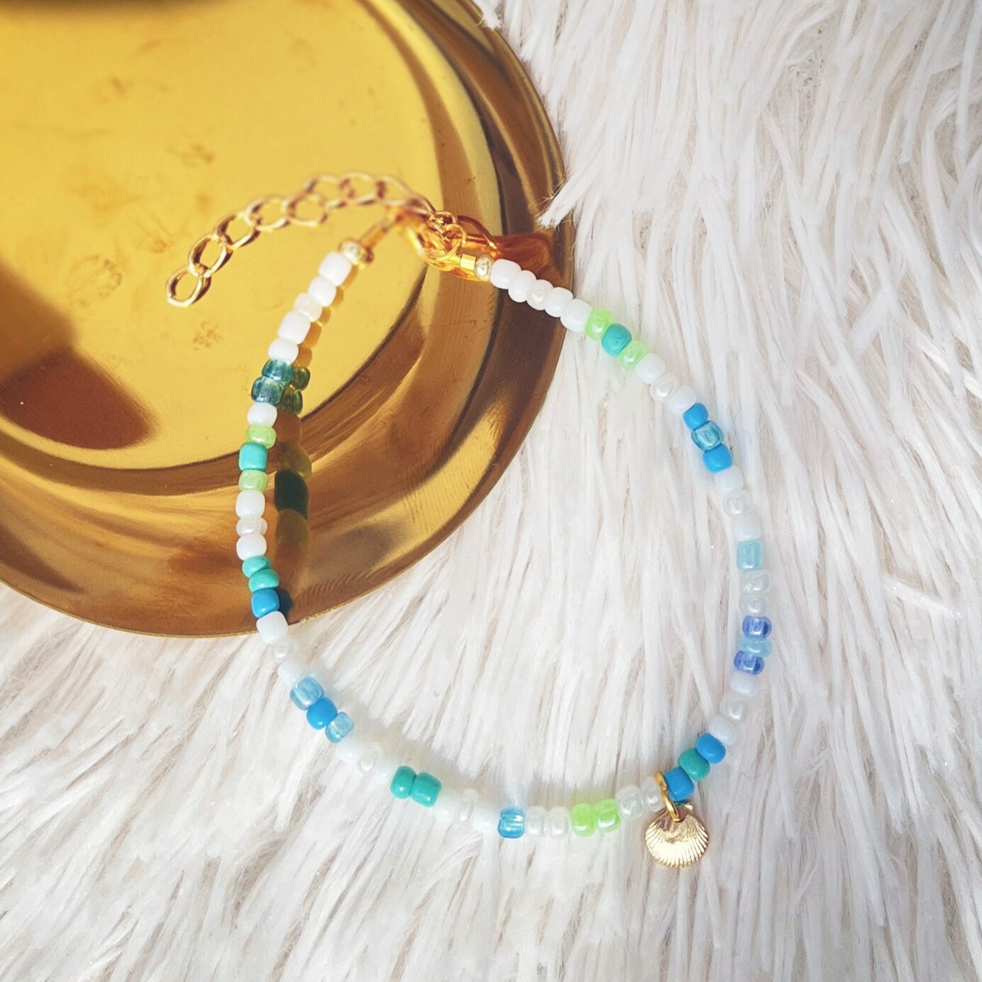 Bracelet, friendship bracelet, white-blue-green, adjustable in length, with pendant