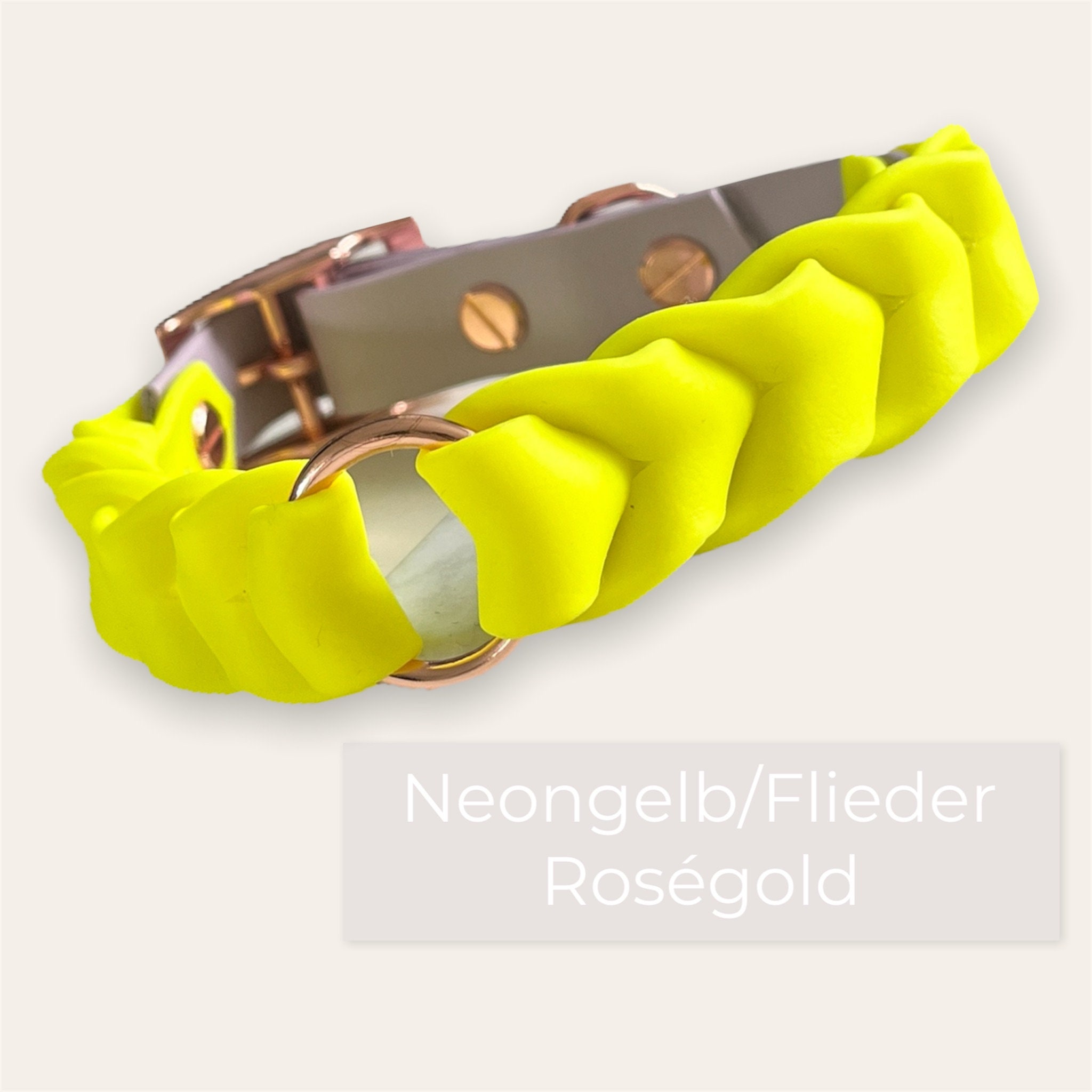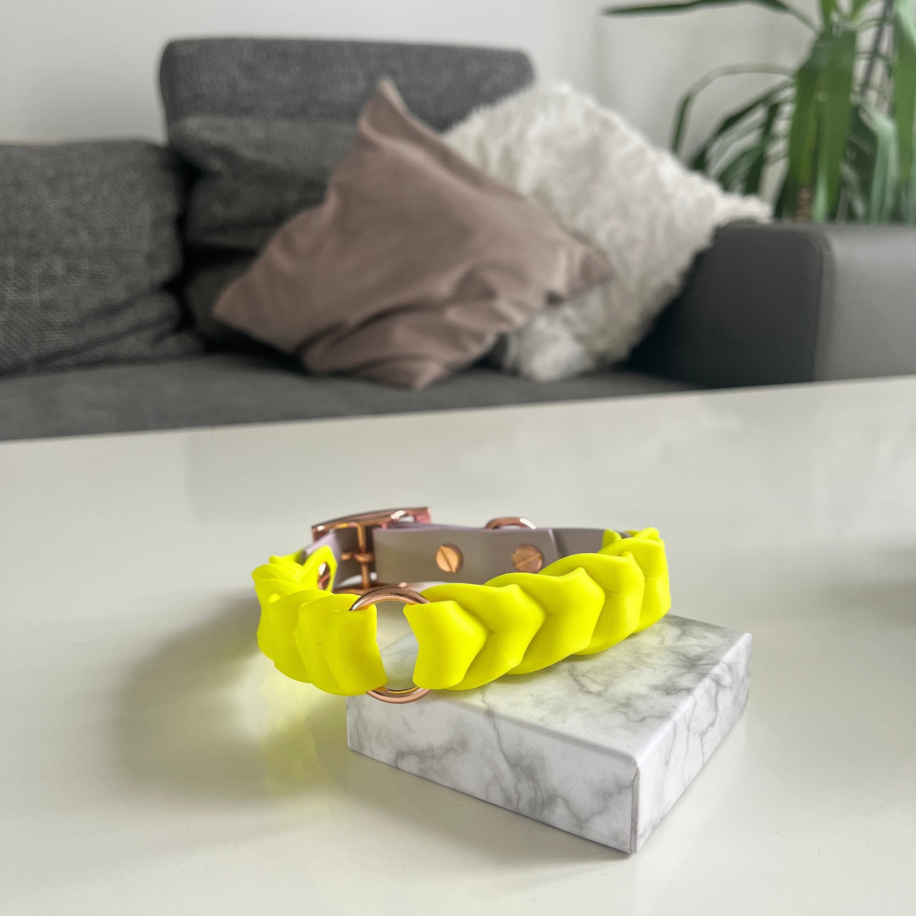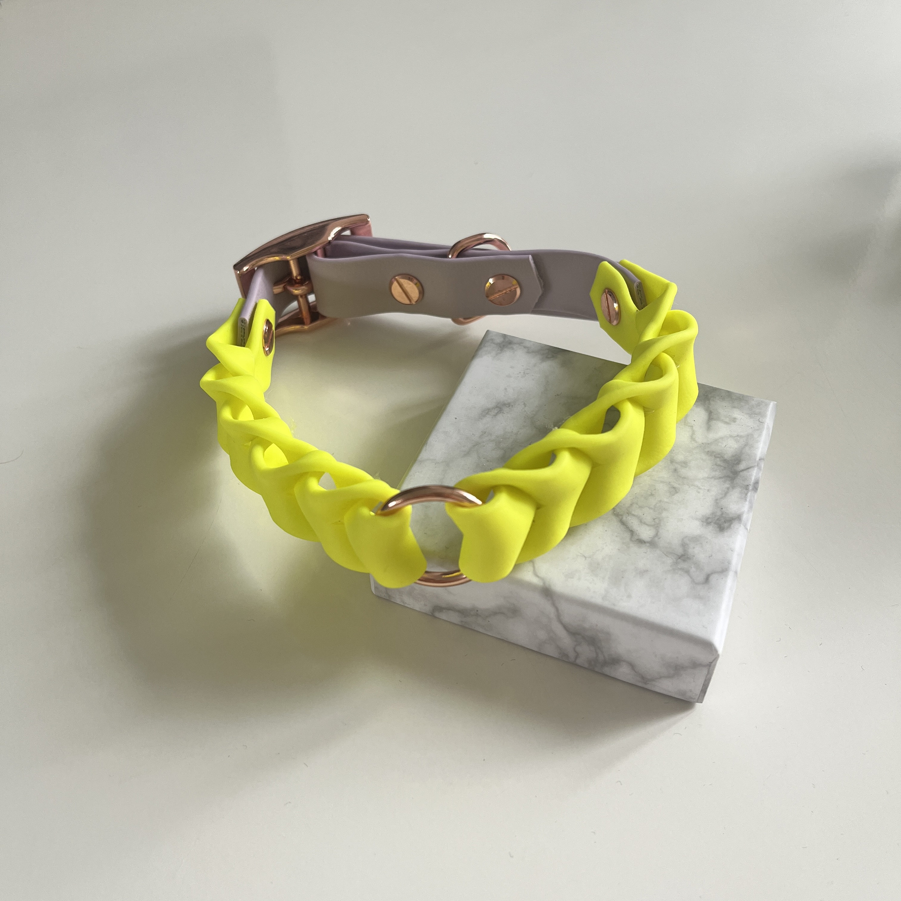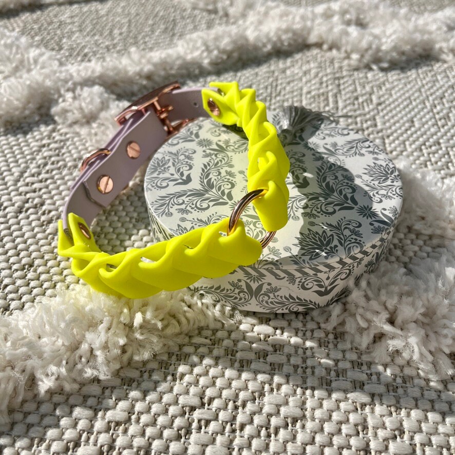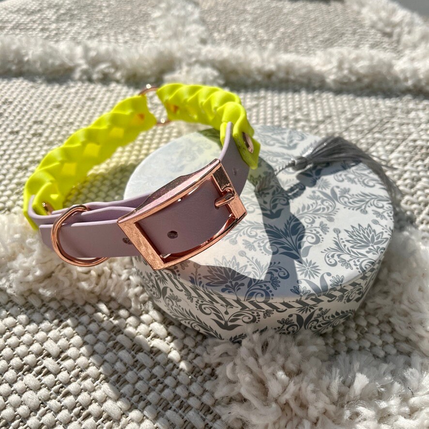 Biothane is a robust material and an alternative to leather. It is easy to clean with water. The fittings for the collar can be chosen in rose gold, gold or silver.