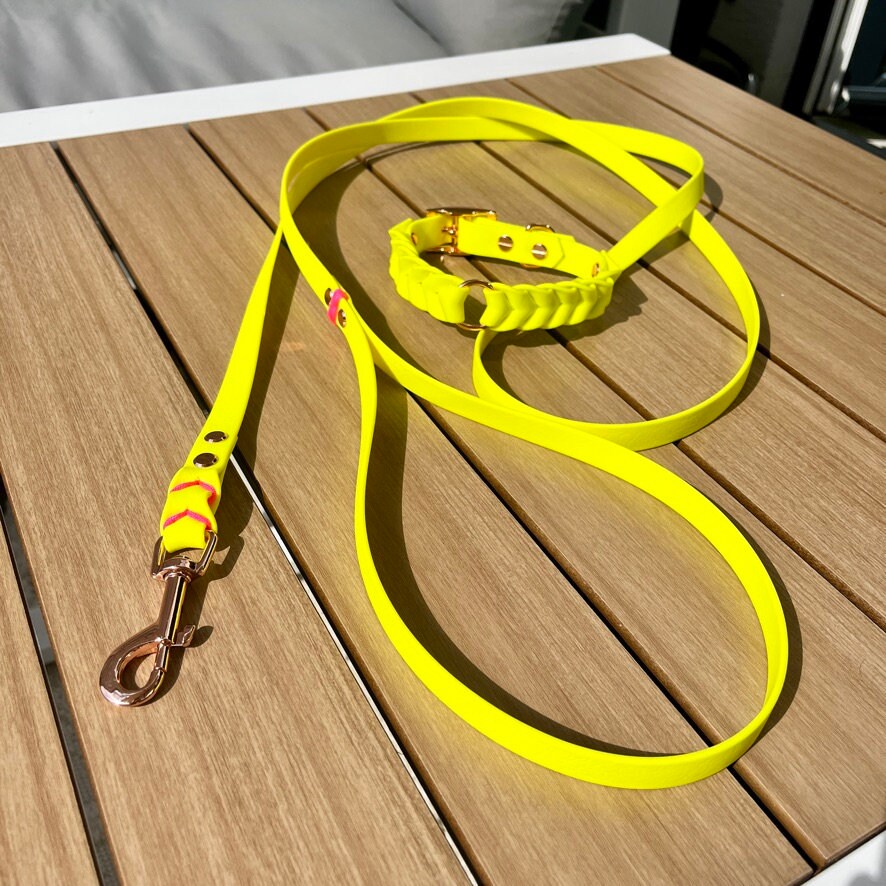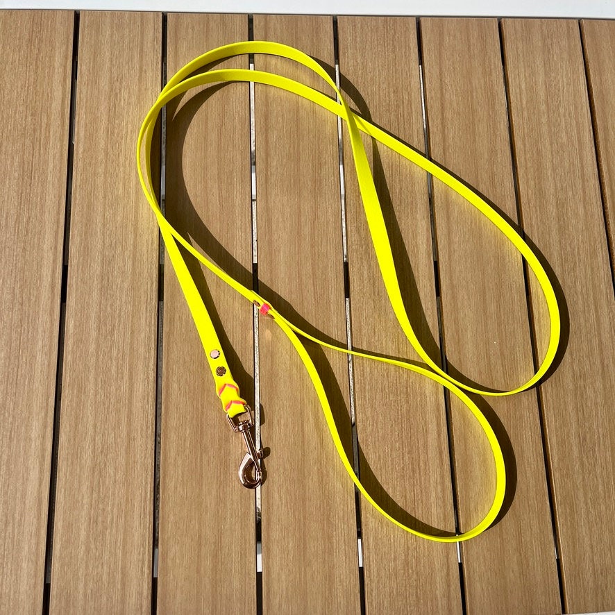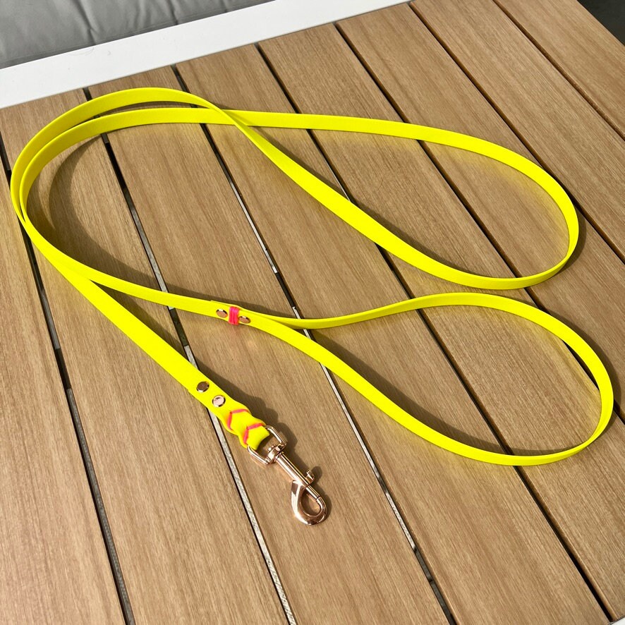 Adjustable Biothane leash in neon yellow and pink. Handmade in Germany.