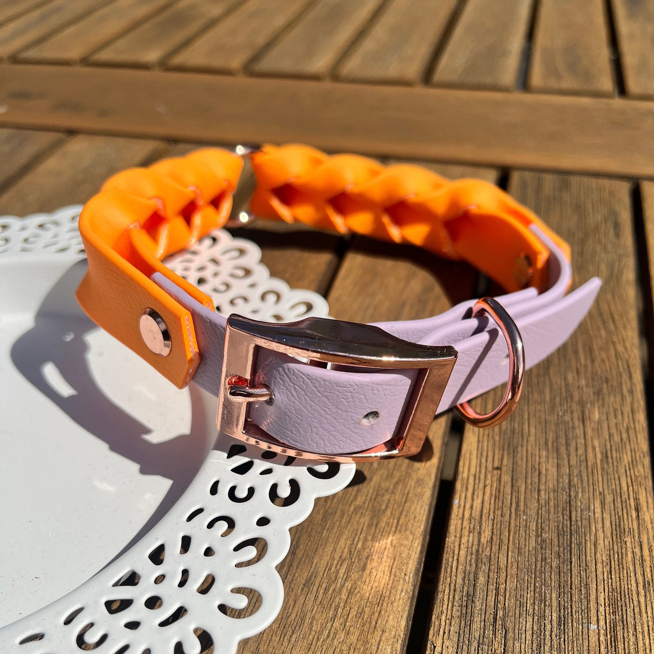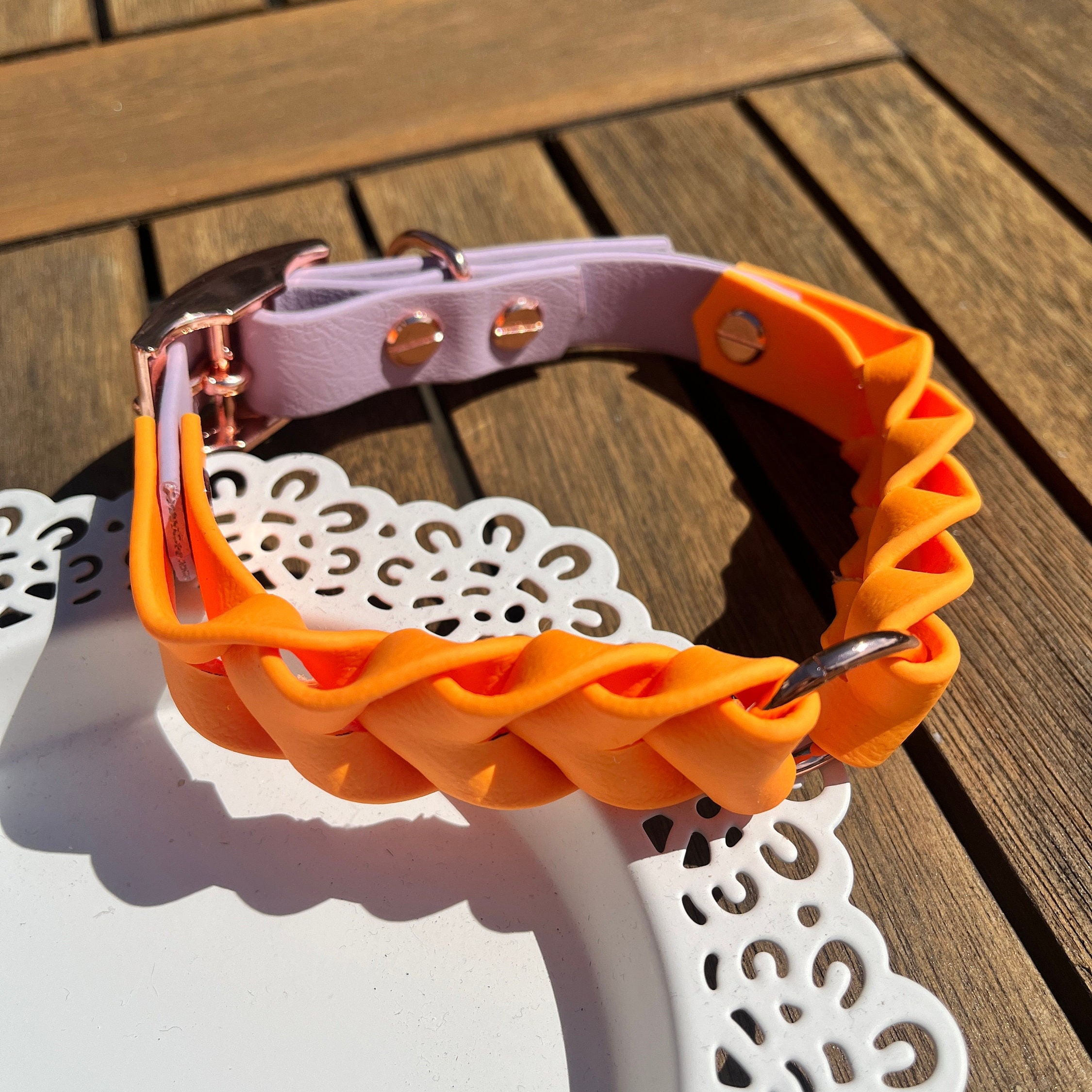Adjustable Biothane collar in orange and lilac. Handmade in Germany.