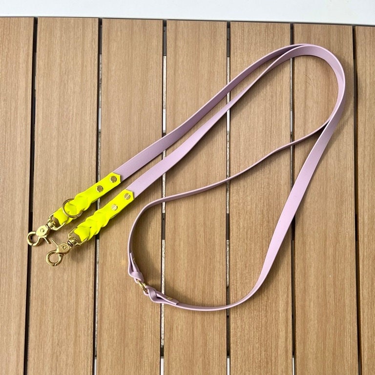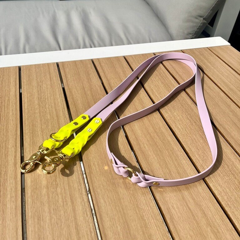 Adjustable Biothane leash in the color combination lilac-neon yellow. Handmade in Germany.