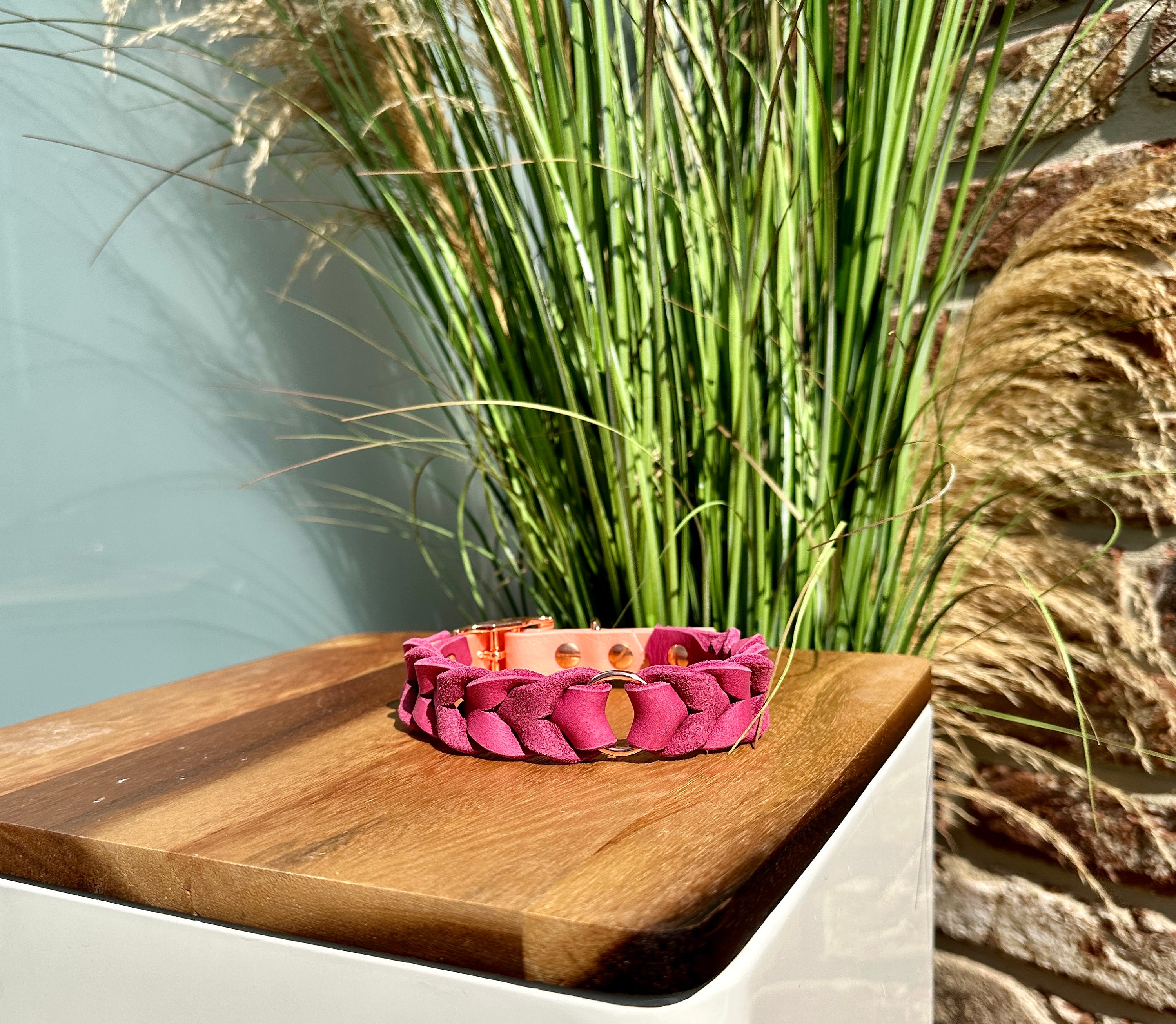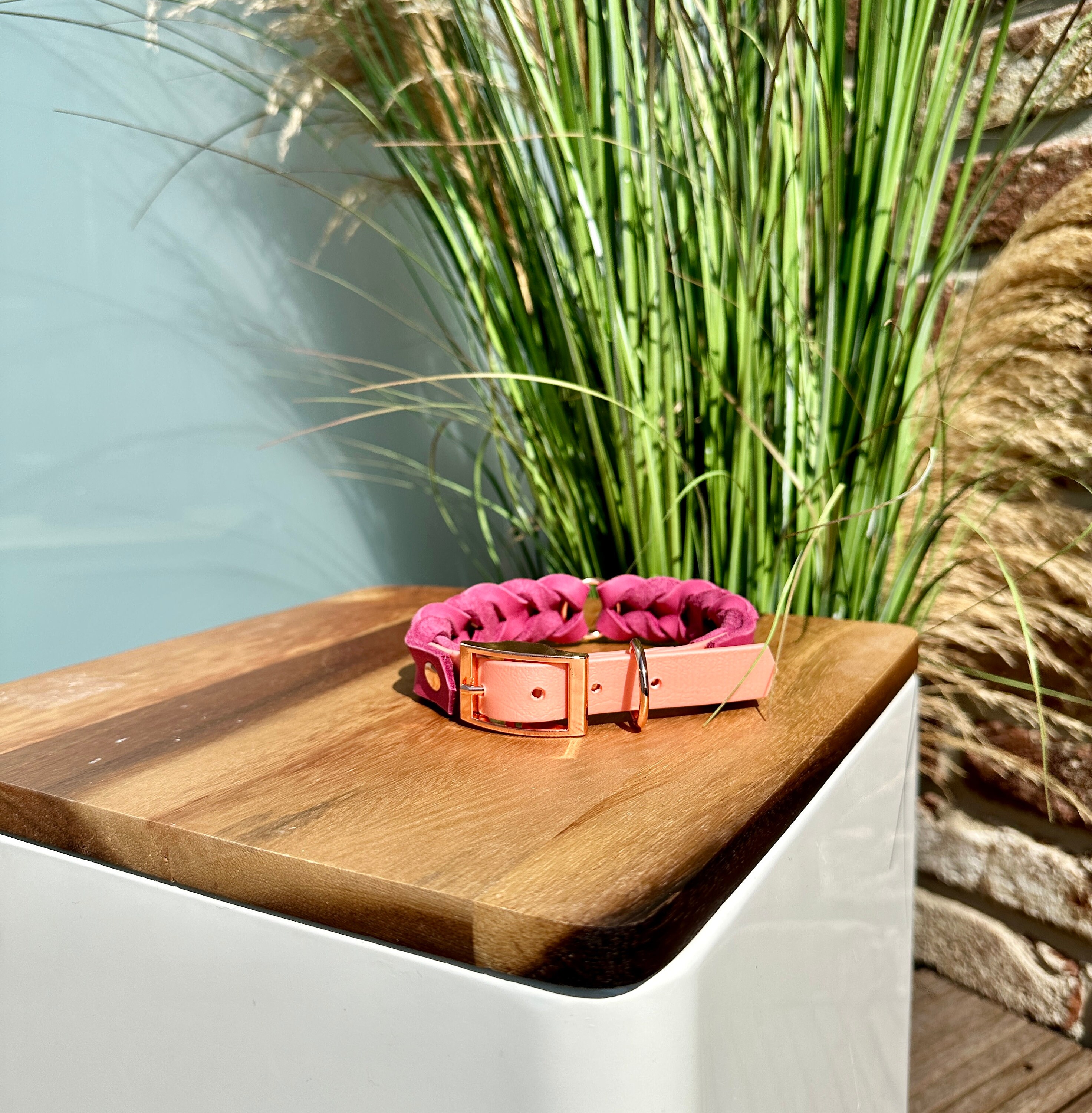 Alle Materialien können in Farbe, Größe und Form variieren. Umwelteinflüsse, Licht oder Wasser können die Beschaffenheit des Materials zudem beeinflussen, es kann mit der Zeit zum Beispiel die Farbe verändern, sich abnutzen oder weiten. Es kann in seltenen Fällen z. B. durch Nässe auf das Fell des Hundes abfärben. Für die Pflege der Materialien sollten nur dafür vorgesehene Produkte verwendet werden. Mensch und Tier können unterschiedlich auf das gegerbte Leder, auf die vernickelten Verschlüsse und die verwendeten Färbemittel der Materialien reagieren – bitte bedenken Sie das vor dem Kauf unserer Produkte. Unsere Verschlüsse haben Industriequalität – trotzdem können sich die Verschlüsse durch ungünstige Umstände öffnen, die Karabiner sich lösen, ein Hund sich aus einem Halsband befreien oder die Leine bei Abnutzung reißen. Für diese Fälle übernehmen wir keinerlei Haftung. Sollte ihr Hund das Grundgehorsam noch nicht befolgen oder z. B. ein ängstliches Tier sein, dann empfehlen wir statt unserer Produkte beispielsweise ein Sicherheitsgeschirr. Unsere verwendeten Beschläge und Materialien in Rosegold und Mattschwarz sind eloxiert, ist somit empfindlicher als unsere Hardware aus Edelstahl und Messing. Die eloxierte Hardware kann somit bei Beanspruchung an Farbe verlieren oder abblättern.